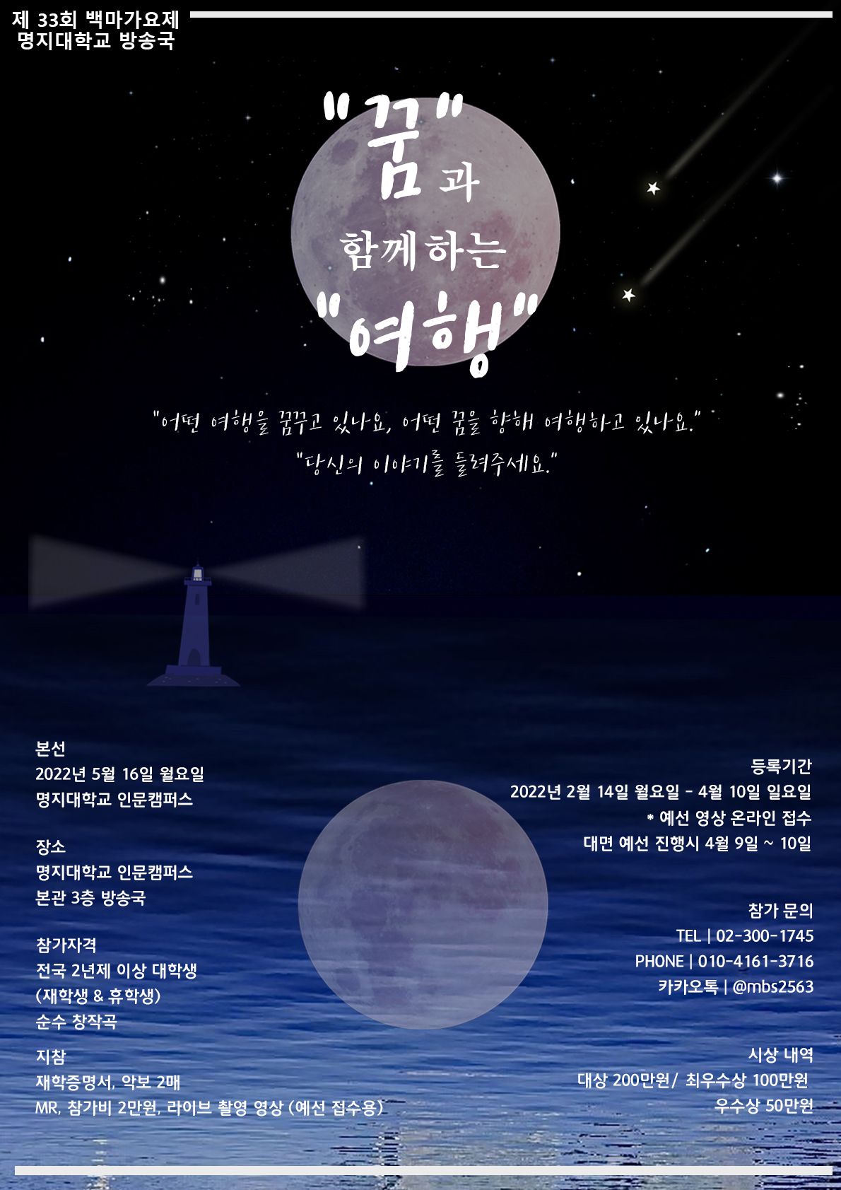 명지대학교 방송국 MBS에서 ‘꿈과 함께하는 여행’이라는 주제로 제33회 백마가요제 예선을 개최합니다.