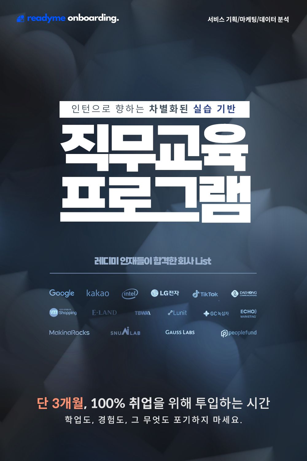 마케팅/서비스기획/데이터분석 인턴으로 향하는 차별화된 실습 기반의 트레이닝 경험을 제공하는 레디미 온보딩입니다.