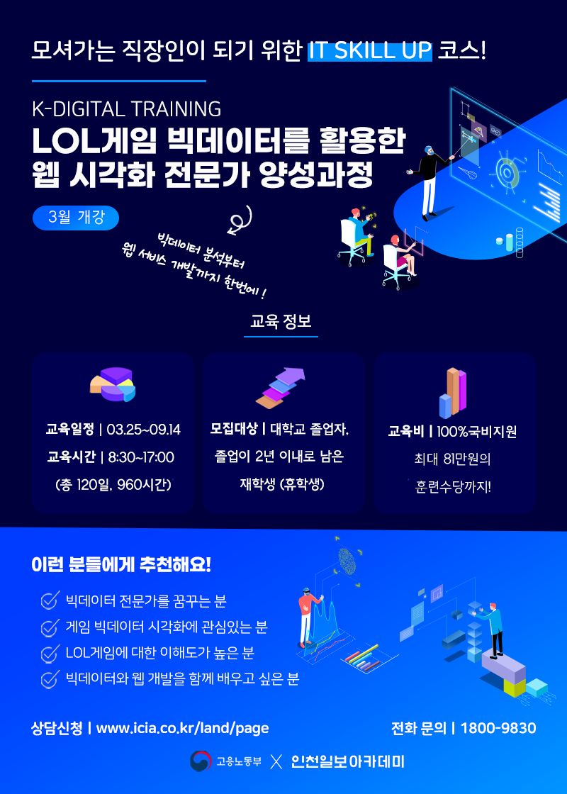 협력기업 실무 빅데이터 연구원에게 빅데이터 분석을 위한 파이썬 프로그래밍과 데이터베이스 구현 능력 배양을 위한 빅데이터 관련 기술, 빅데이터를 활용한 웹 서비스 개발을 위한 백엔드 프로그래밍 관련 기술, 빅데이터 시각화를 위한 프론트엔드 프로그래밍 관련 기술을 배우고, LOL(리그오브레전드) 게임 빅데이터를 활용한 시각화 실무 프로젝트를 수행하여, 현업에서 요구하는 빅데이터 전문가 양성을 목표로 한다.