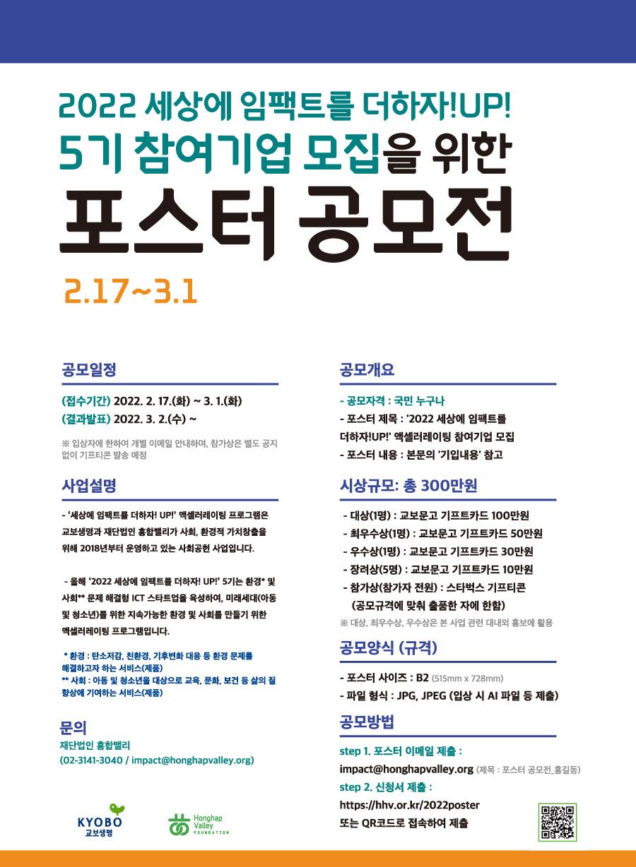 - 공모전명 : ‘2022 세상에 임팩트를 더하자! UP!’ 5기 참여기업 모집을 위한 홍보용 포스터