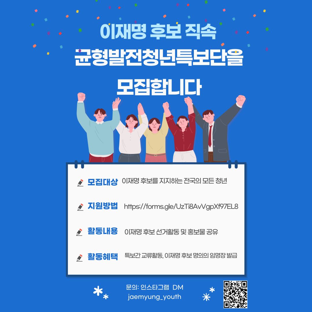 더불어민주당 이재명 대통령후보 직속 균형발전청년특위에서 활동할 단원을 모집합니다!