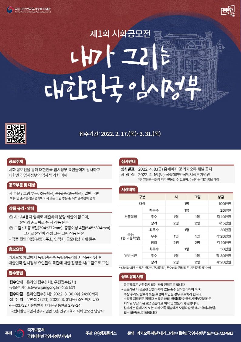 - 수상작의 저작권은 창작자 본인이 가지되, 국립대한민국임시정부기념관은 저작권 무상 이용권을 소유하고 위탁 및 양도가 가능합니다.