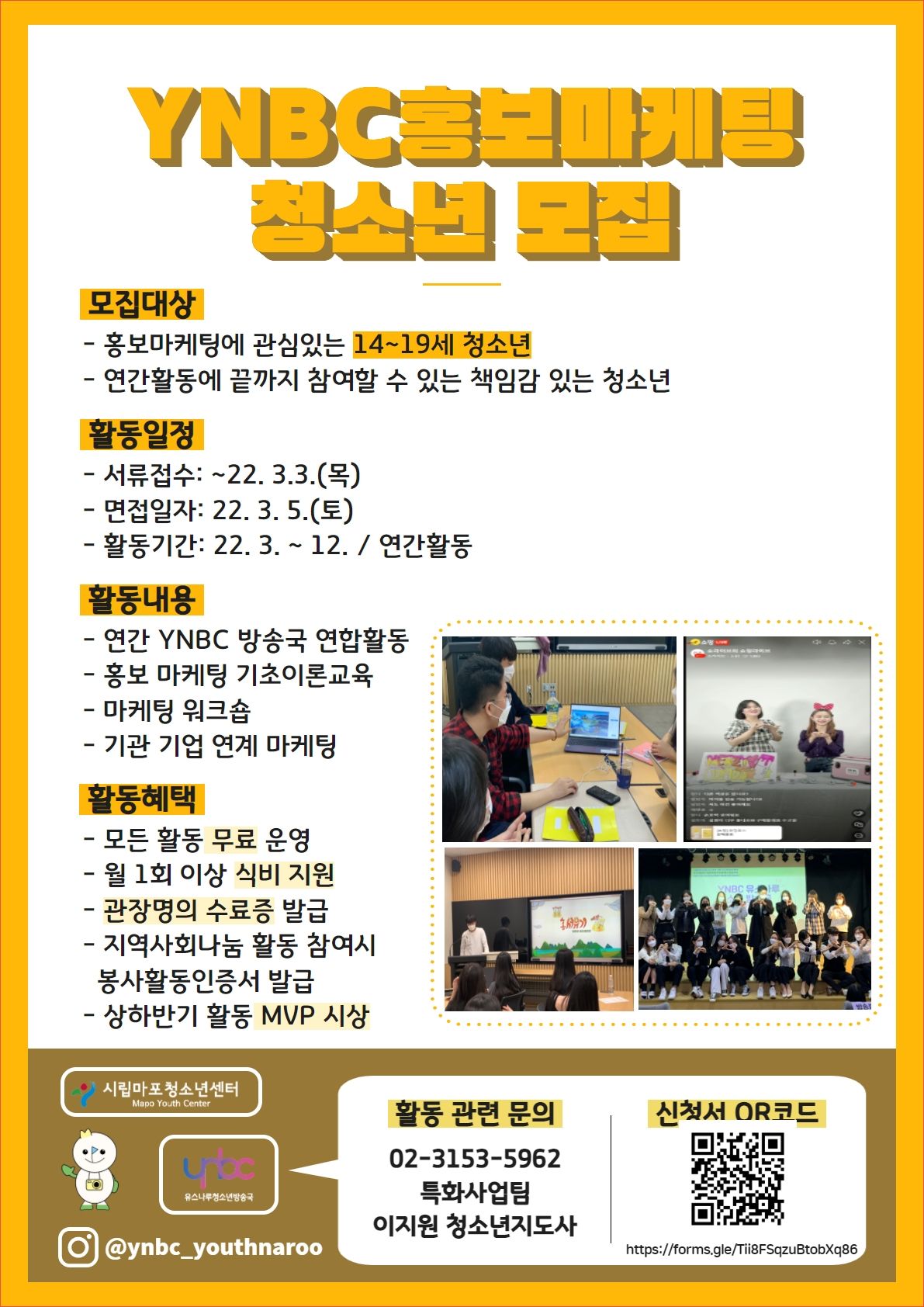 - 카카오톡 채널, 페이스북, 인스타그램 ▶ '시립마포청소년센터 유스나루' 검색 후 문의 (화~토 09:00~18:00)