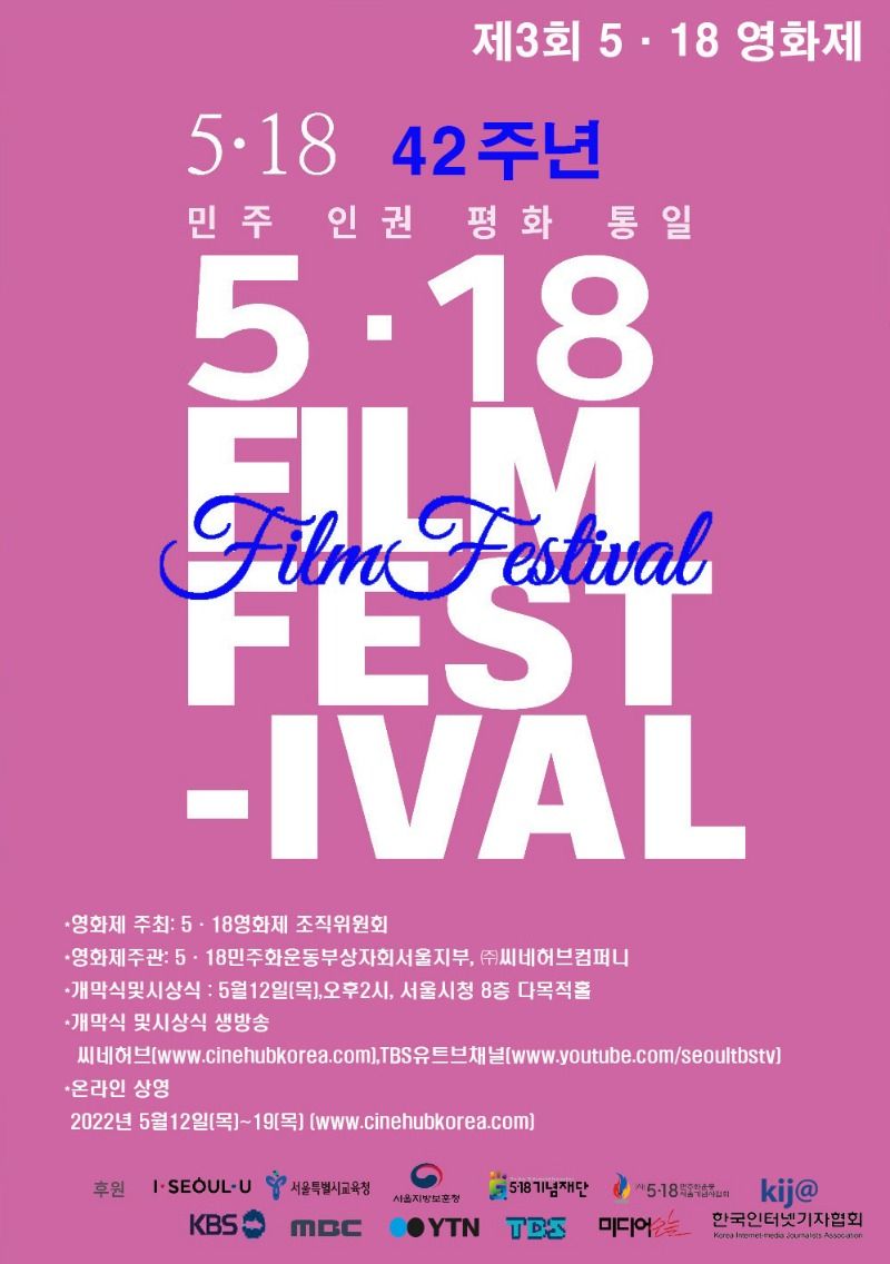 1980년 5.18 민주화운동 42주기를 맞아 '5.18 민주화운동 부상자회 서울지부'와 단편영화 온라인 플랫폼 '(주)씨네허브 컴퍼니'가 함께하는 '5.18 영화제'가 3회로 다시 돌아왔습니다. 기발한 상상력과 영화예술에 대한 열정으로 뭉친 신작들과 새로운 관객 여러분들과 만날 수 있길 기대하겠습니다. 여러분들의 많은 참여와 관심 부탁드립니다~