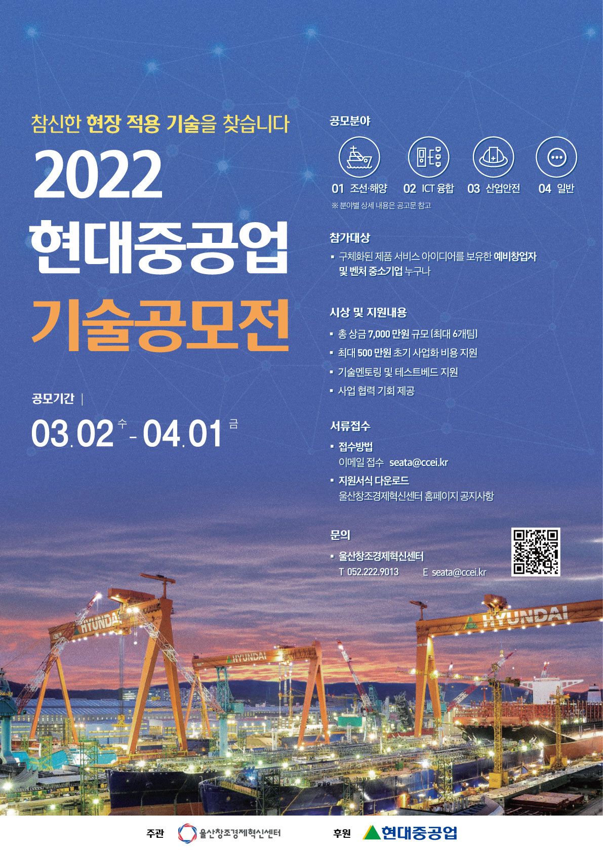 - (기술멘토링 및 현장테스트) 현대중공업의 현장 노하우 및 인프라를 활용한 현장 적용 가능성 등 입상팀 기술애로 해결 지원
