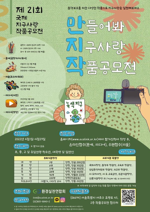 ※ 이외 공모전과 관련한 자세한 내용, 유의 사항은 반드시 홈페이지(www.ecolink.or.kr)를 확인하시고 참가하시기 바랍니다.