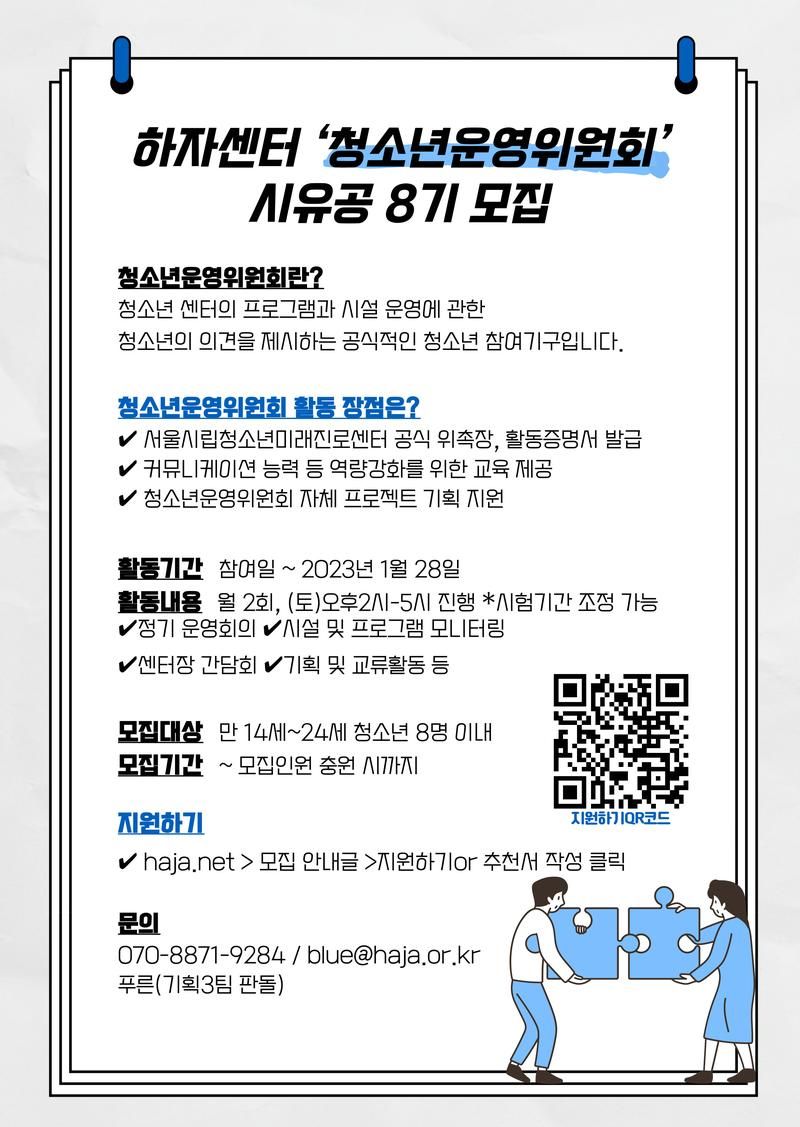 : 청소년 활동 활성화를 위해 자체 프로젝트를 기획하고 진행합니다. 또한, 하자 내/외의 다양한 청소년 그룹과 교류합니다.