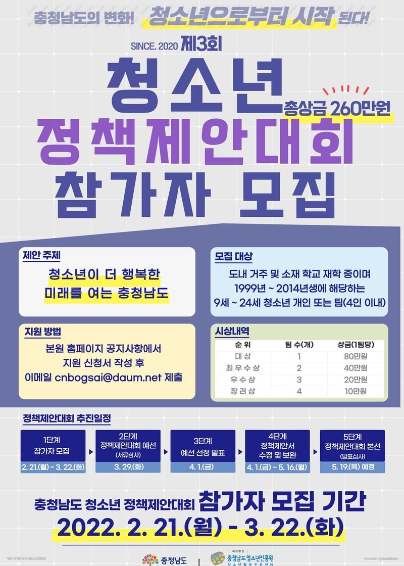 청소년으로서 충청남도에 정책을 제안하는! 총260만원 상당의 상금이 걸려있는! 충청남도 청소년정책제안대회!
