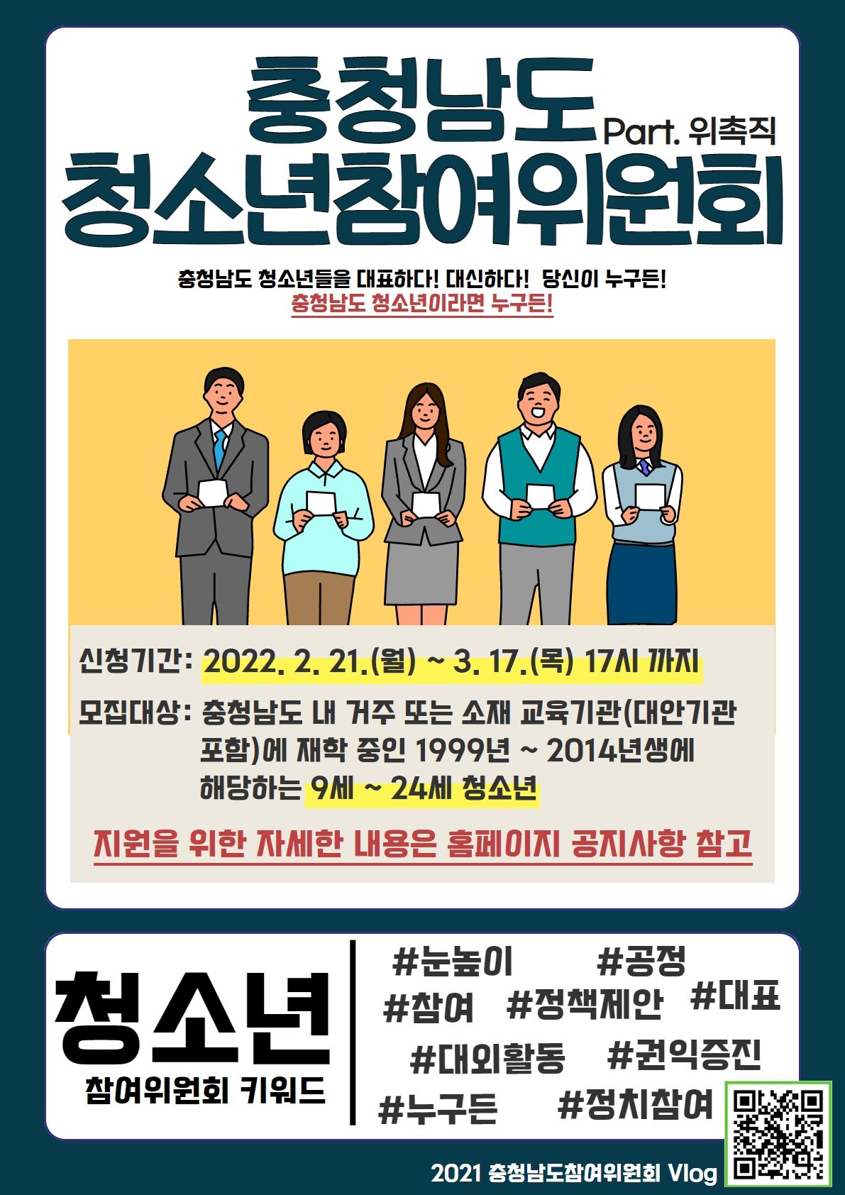 재단법인 충청남도청소년진흥원 활동진흥센터에서는 도내 청소년 정책 및 사업과정에 청소년들이 주체적으로 참여하고, 청소년 눈높이에서 정책을 개발하여 청소년 권익증진을 도모하고자 아래와 같이 「2022 충청남도청소년참여위원회」를 모집하오니 역량있는 도내 청소년들의 많은 관심과 참여 바랍니다.