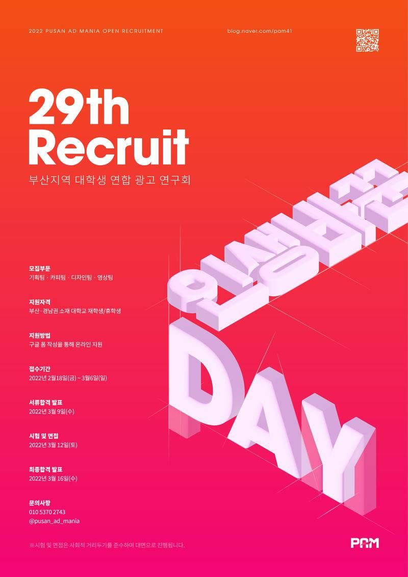 1994년에 창설하여 29년 전통을 자랑하는 부산경남 지역 대학생 연합 광고 동아리 부산 애드마니아(PAM)에서 29기 파머를 모집합니다!(부산 최초! 최고!의 광고 동아리)