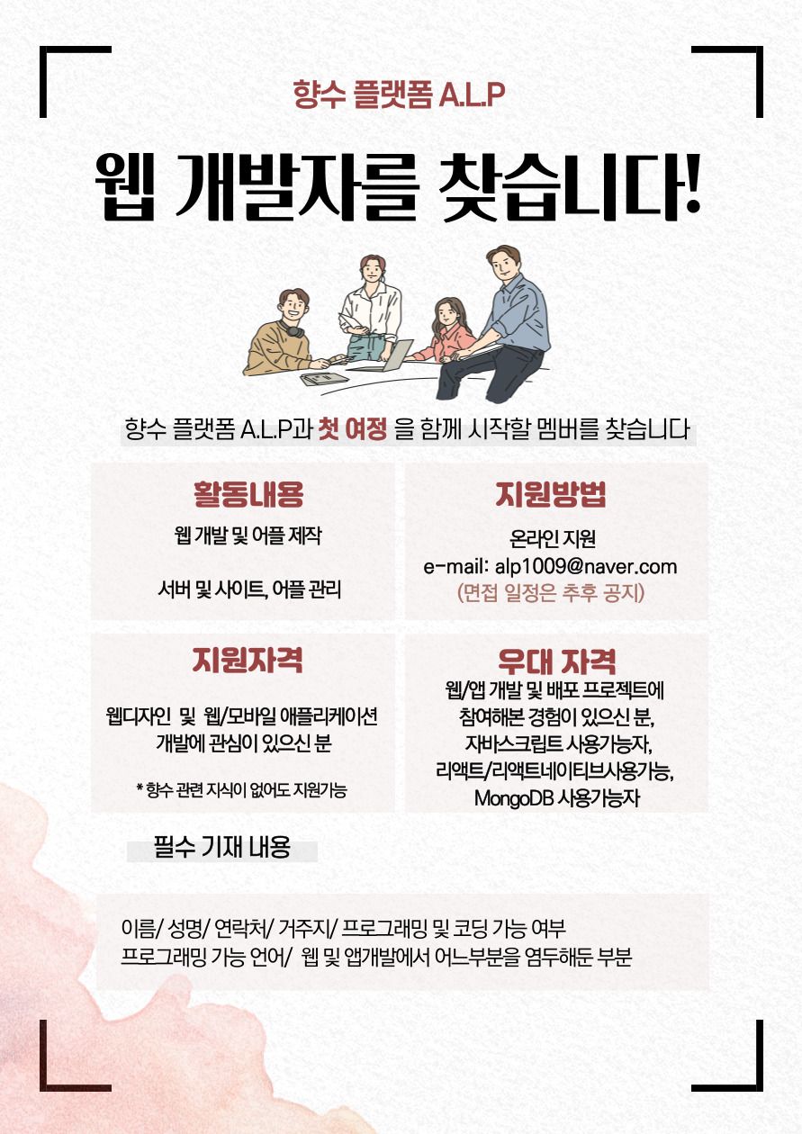 저희 Team A.L.P.은 향수를 보기 쉽게 정리하는 것만이 아니라 나아가 소비자의 취향을 반영한 향수 추천을 통해 향수에 관심이 없으신 분들도 쉽게 향수에 다가갈 수 있게 하는 사이트를 만들고자 합니다. 이러한 저희는 함께 그 여정에 동참하고자 하는 대학생 웹 개발자를 찾고 있습니다.