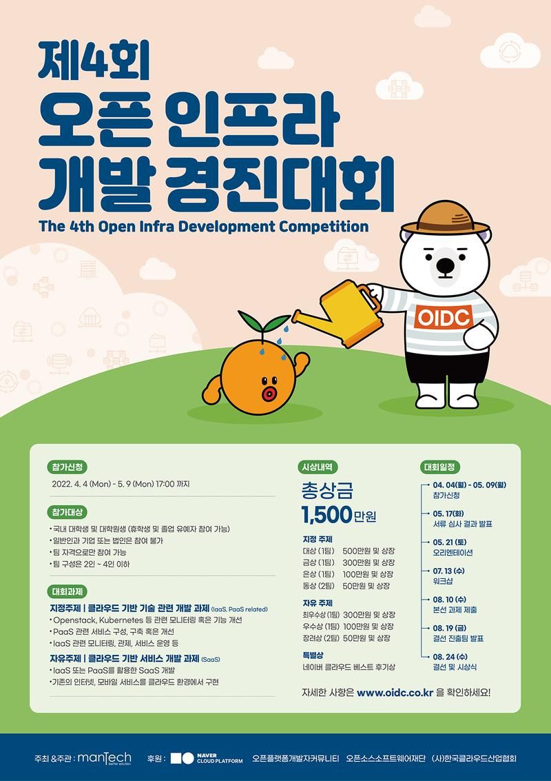 ㈜맨텍은 대학(원)생들이 SW 기업 현장의 개발환경을 이해하고, 클라우드 기반 최신 개발 및 운영 환경을 습득하며, 오픈소스를 활용해 창의적인 아이디어를 SW로 개발하는 능력을 향상시키고, 역량 있는 국내 중소기업에서 함께 성장할 수 있는 인재를 양성하기 위해 ‘제4회 오픈 인프라 개발 경진 대회 (OIDC 2022)’를 개최합니다.