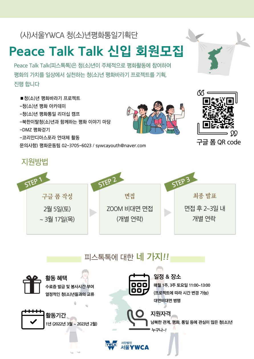 사)서울YWCA 청(소)년 평화통일기획단 Peace Talk Talk 신입 회원 모집