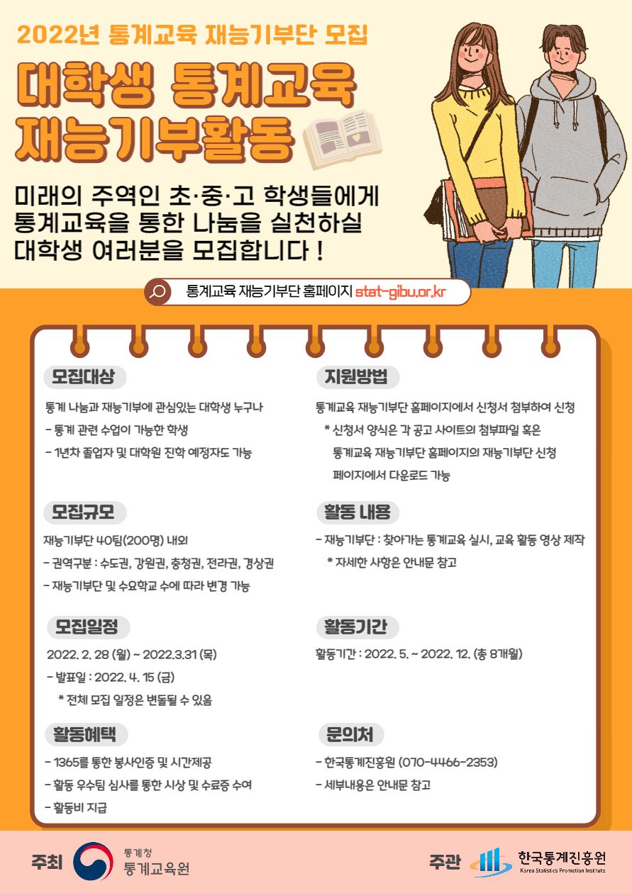 통계청 통계교육원이 주최하고 한국통계진흥원이 주관하는 「2022년 통계교육 재능기부단」 의 재능기부단을 모집합니다!!