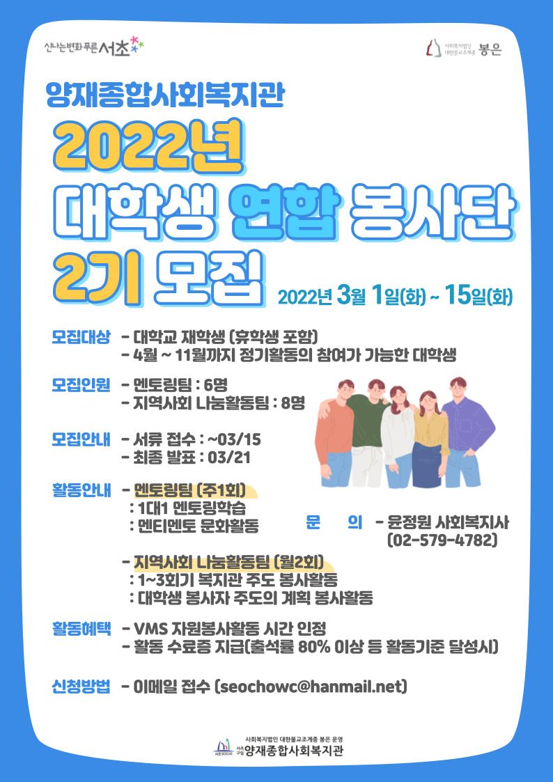 저희 양재종합사회복지관에서는 2022년 제2기 대학생연합봉사단 봉사단을 모집합니다.