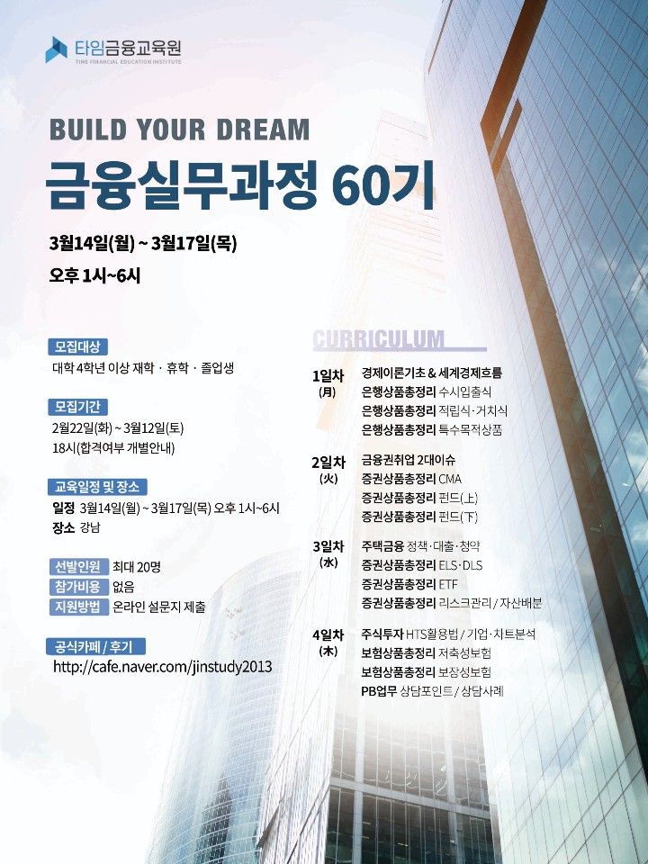 은행/증권/보험 분야별 실무, 자소서, 면접 컨셉 등 상반기 대비 "단기간 Jump up 금융교육"입니다.
