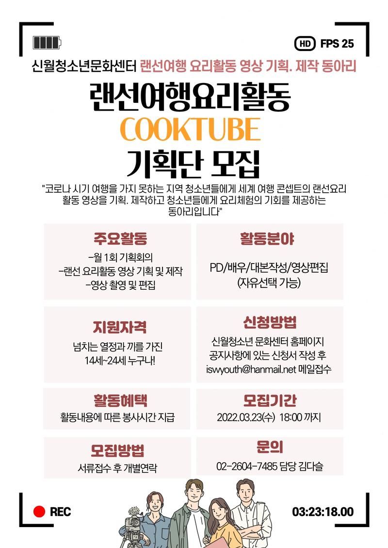 안녕하세요! 신월청소년문화센터 랜선여행 요리활동 영상 기획 및 제작 동아리 COOKTUBE(쿡튜브)에서 신입 기획단원을 모집합니다!!
