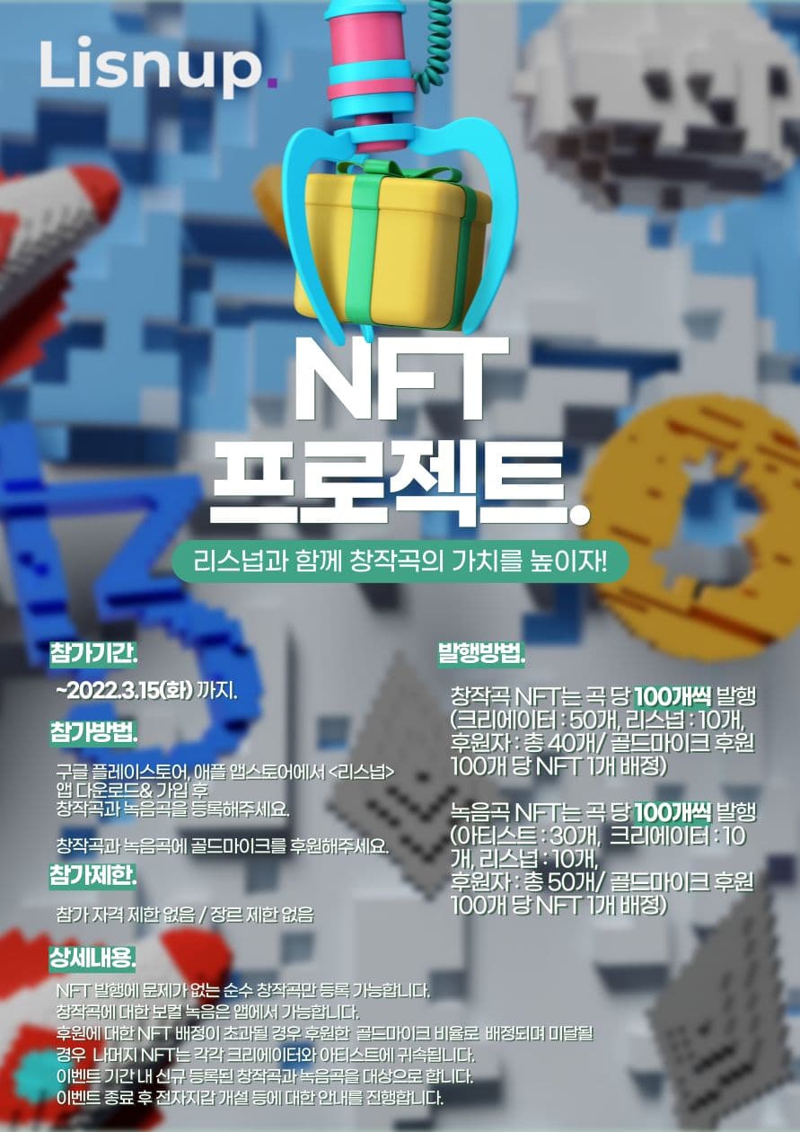 녹음곡 NFT는 곡 당 100개씩 발행(아티스트 : 30개, 크리에이터 : 10개, 리스넙 : 10개, 후원자 : 총 50개/ 골드마이크 후원 100개 당 NFT 1개 배정)