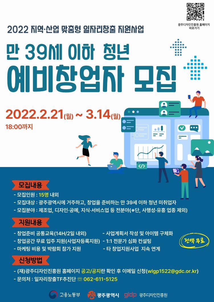청년 예비창업자의 성공 창업을 지원합니다. (재)광주디자인진흥원에서는 광주지역 청년 예비창업자의 성공적인 창업을 지원하기 위하여 아래와 같이 미취업 예비창업자를 모집하오니 창업을 희망하는 청년 예비창업자(창업 재도전자 포함)의 많은 관심과 참여 바랍니다.
