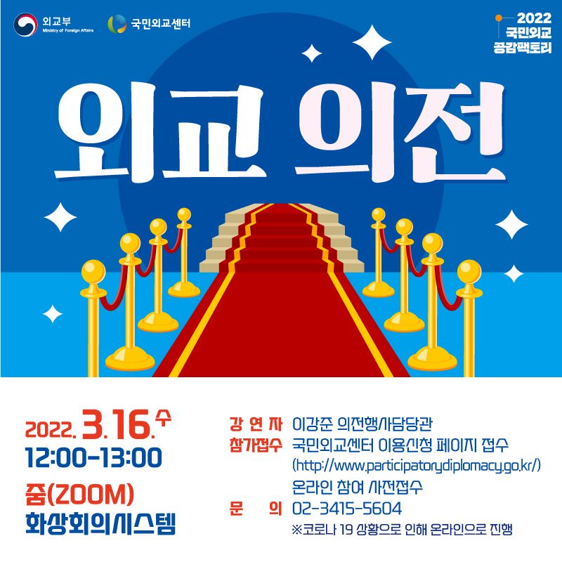 외교부는 3월 16일(수) 12:00-13:00 “외교 의전”을 주제로 국민외교 공감팩토리를 개최할 예정입니다. 이번 행사는 코로나 19 방역을 위한 사회적 거리두기 상황으로 인해 온라인으로 진행될 예정입니다. 국민 여러분의 많은 관심과 참여를 부탁드립니다.