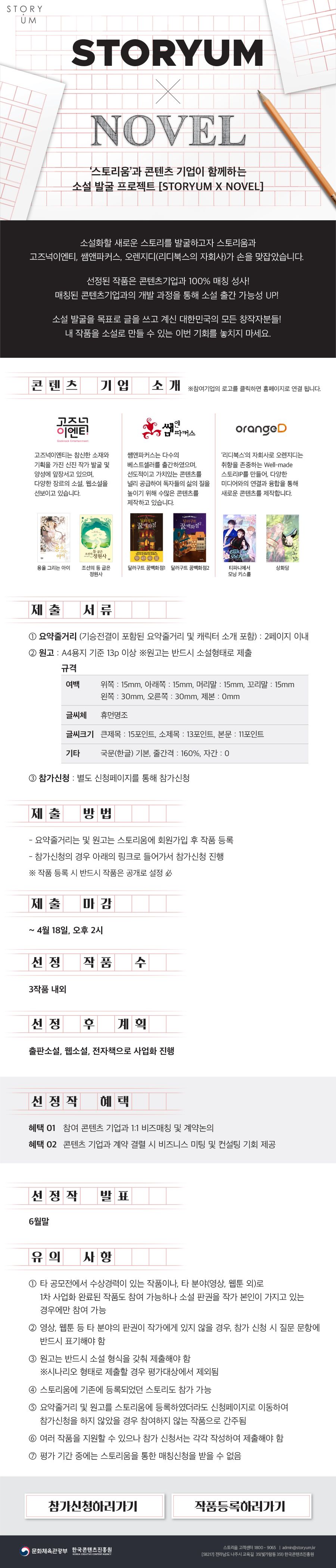 한국콘텐츠진흥원과 콘텐츠기업 고즈넉이엔티,쌤앤파커스,오렌지D와 함께하는 소설발굴 프로젝트로 선정 작품은 콘테츠기업과 함께 출판소설,웹소설,전자책으로 사업화를 진행하는 것에 목적을 두고 있습니다.