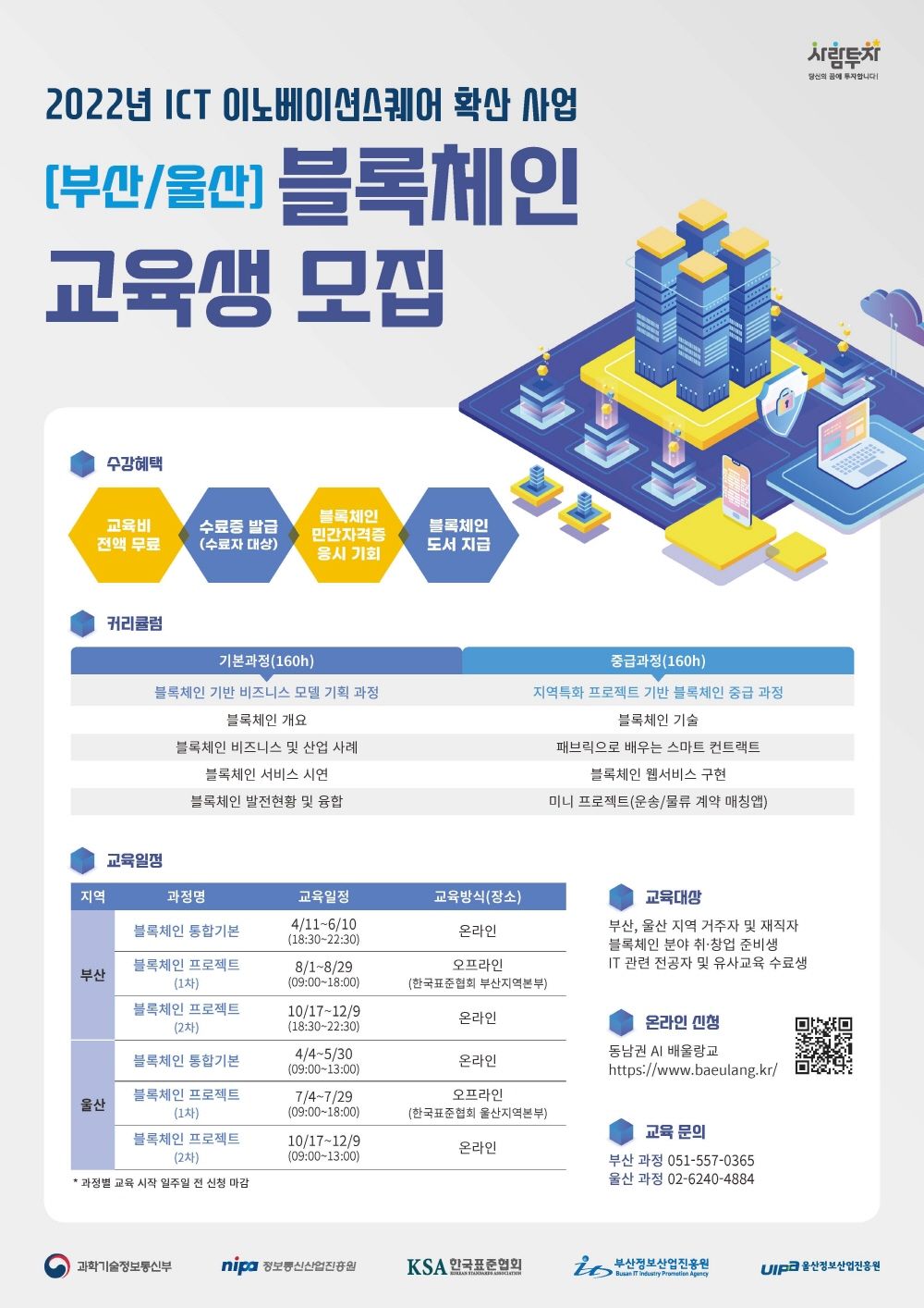 - 수강혜택 : 교육비 전액 무료, 과정별 수료증 발급, 한국표준협회 블록체인 민간자격증(2급) 응시 기회 제공, 관련 참고도서 지급