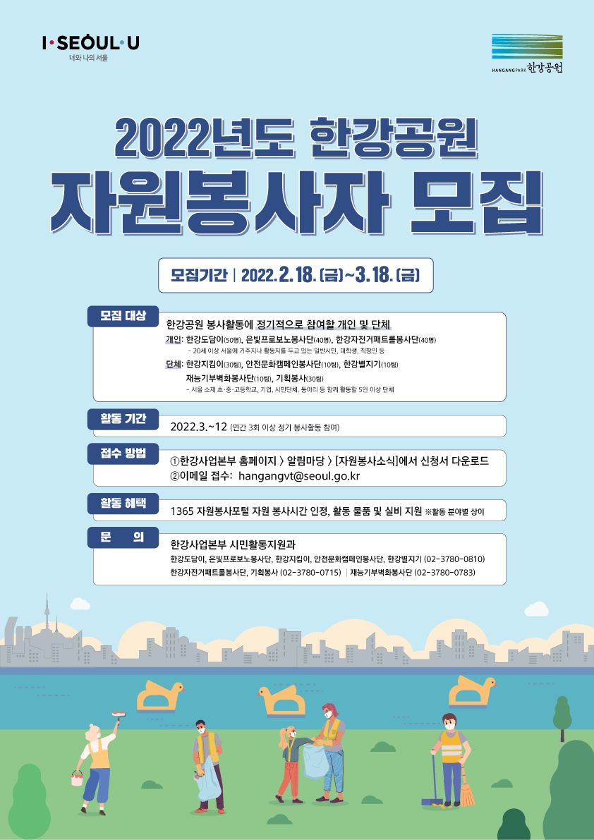 - 2022년 한강공원 봉사활동에 정기적으로 참여 할 개인 및 단체 자원봉사자