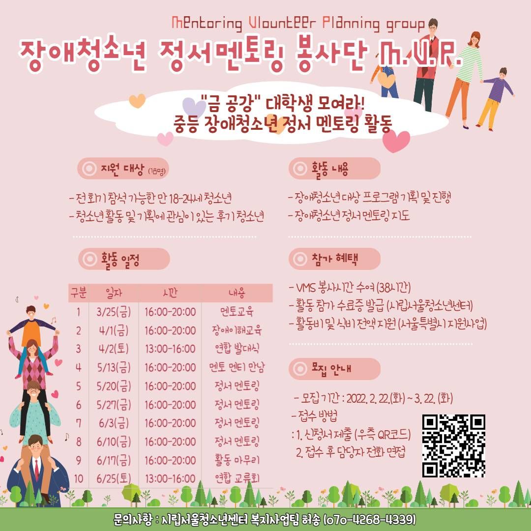중등장애청소년 정서멘토링봉사단, "M.V.P.-Mentoring Vlounteer Planning group" 담당자 허송입니다. 우리 프로그램에 관심가져주셔서 감사합니다.