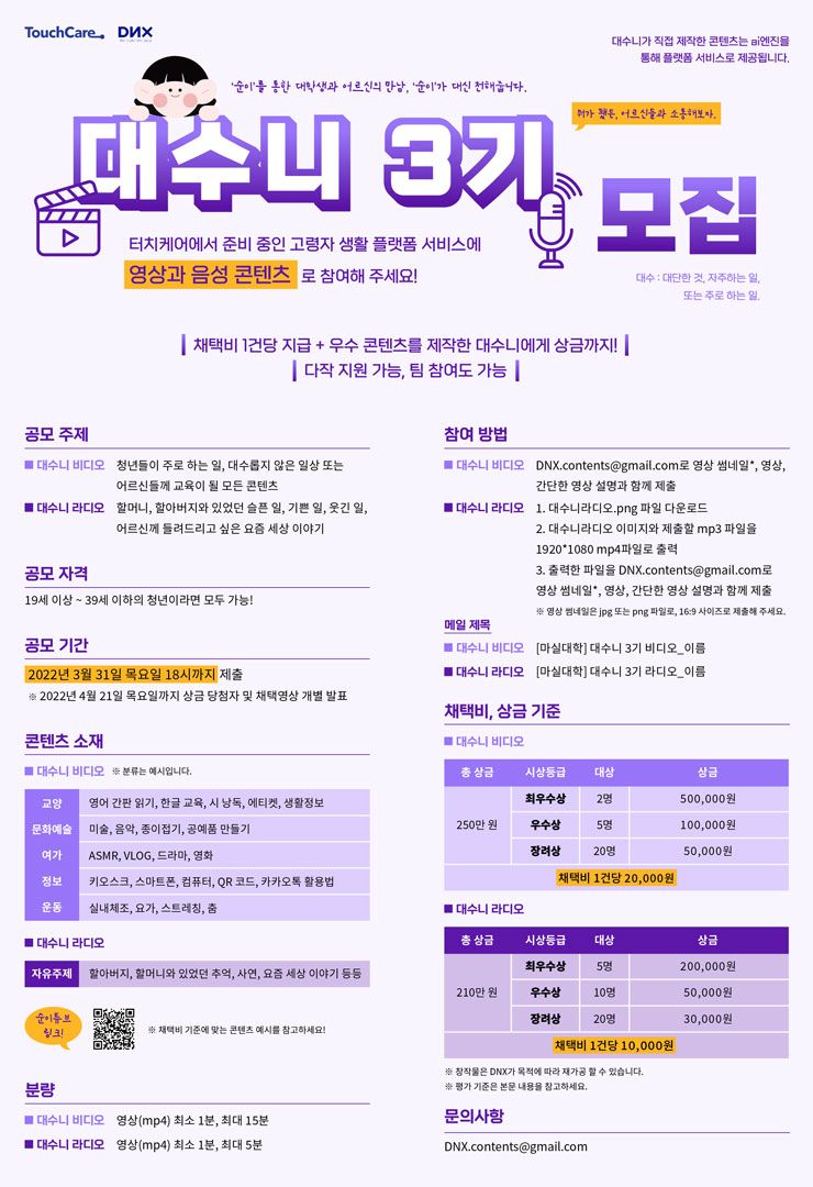 터치케어에서 준비 중인 고령자 생활 플랫폼 서비스에 영상과 음성 콘텐츠로 참여 해주세요!