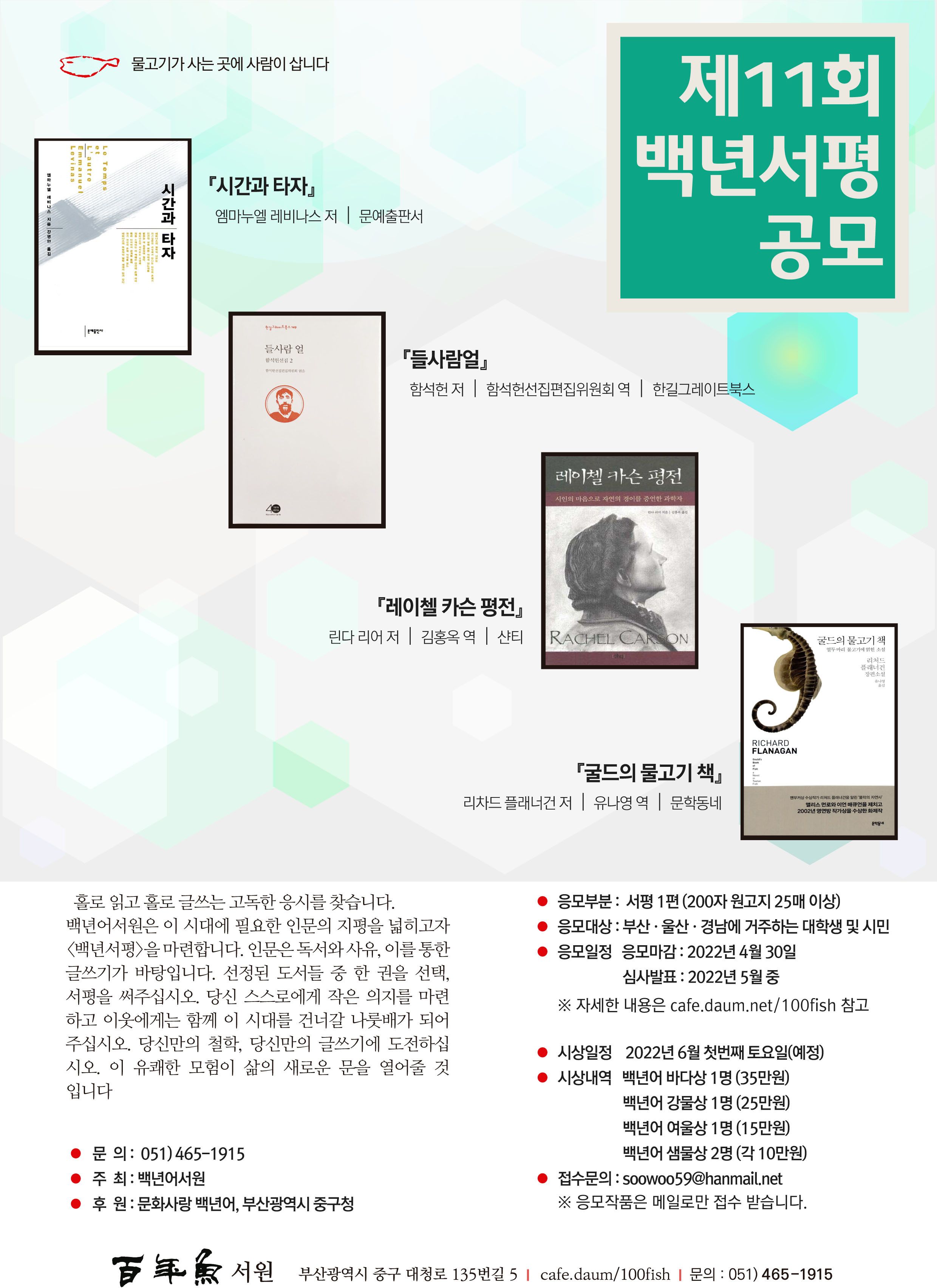 백년어서원은 이 시대에 필요한 인문의 지평을 넓히고자 <백년서평>을 마련합니다. 인문은 독서와 사유, 이를 통한 글쓰기가 바탕입니다. 선정된 도서들 중 하나를 선택, 서평을 써주십시오. 당신 스스로에게 작은 의지를 마련하고 이웃에게는 함께 이시대를 건너갈 나룻배가 되어주십시오. 당신만의 철학, 당신만의 글쓰기에 도전하십시오. 이 유쾌한 모험이 삶의 새로운 문을 열어 줄 것입니다.