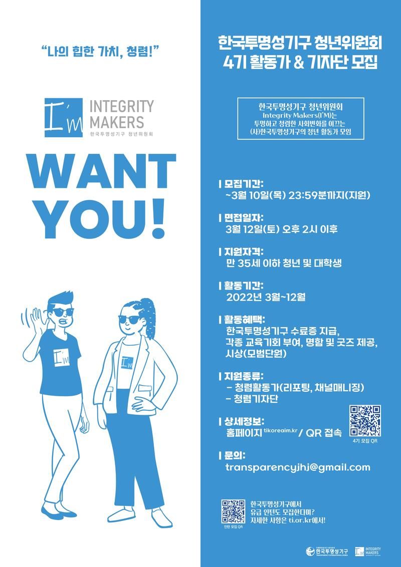 한국투명성기구 청년위원회(I'M)에서 올해 1년간 같이 활동하실 인재를 모십니다!