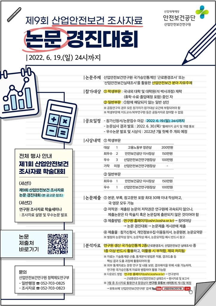 - 제출방법:연구원홈페이지(oshri.kosha.or.kr)→참여마당→논문경진대회→논문제출 게시판에 제출
