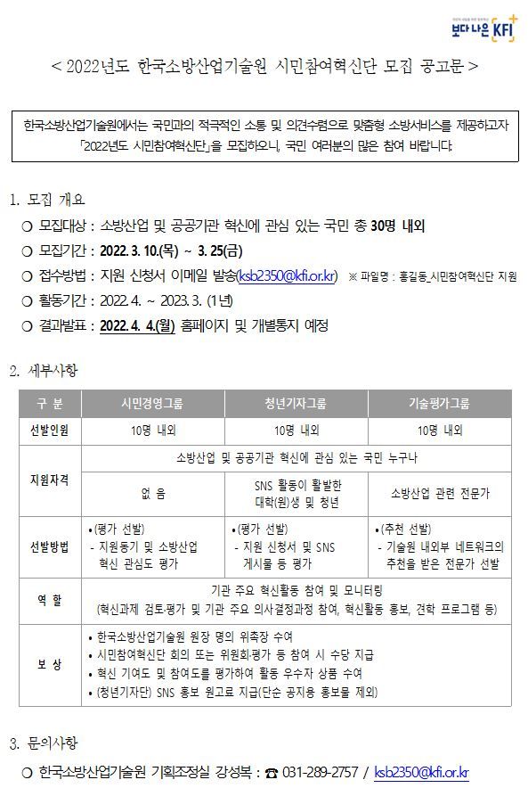 ❍ 모집대상 : 소방산업 및 공공기관 혁신에 관심 있는 국민 총 30명 내외