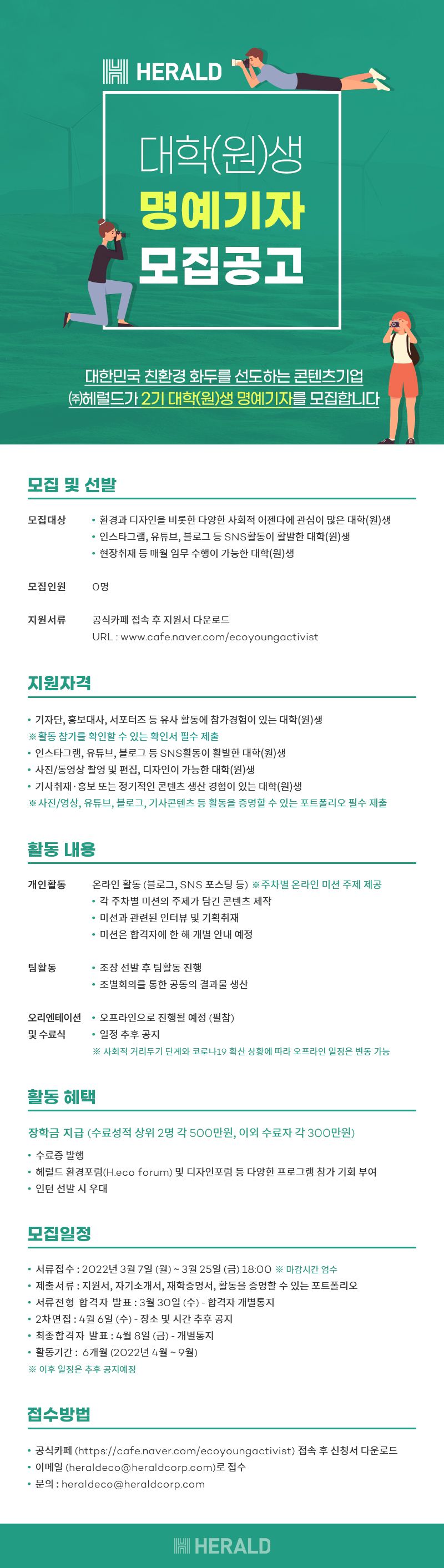 대한민국 친환경 화두를 선도하는 콘텐츠기업 ㈜헤럴드가 2기 대학(원)생 명예기자를 모집합니다.