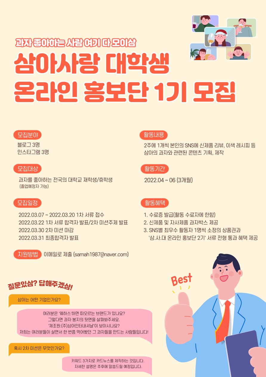 소비자들이 안심하고 먹을 수 있는 과자를 만드는 회사, ㈜삼아인터내셔날에서 과자를 좋아하고 콘텐츠 기획과 제작에 관심이 많은 '삼아사랑 대학생 온라인 홍보단 1기'를 모집합니다!