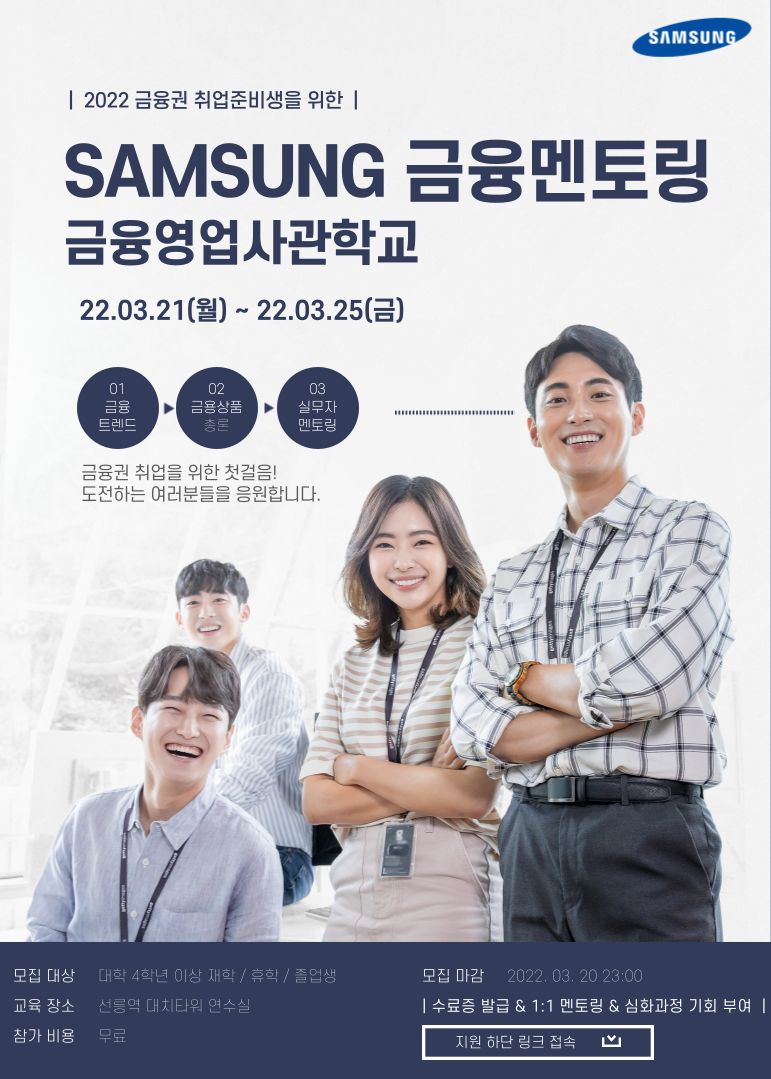 삼성 생명 금융 영업 전문가 과정은 취업을 앞둔 대학생들의 희망찬 비전을 위해 다양한 지식과 경험의 장을 만들어 드립니다. 삼성 생명 금융 영업 전문가 과정을 통해 당신의 가능성을 발견하세요.