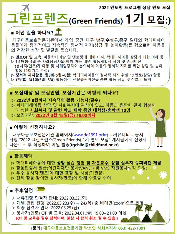 대구광역시아동보호전문기관에서는 2022년 그린프렌즈(Green Friends) 1기를 모집합니다.