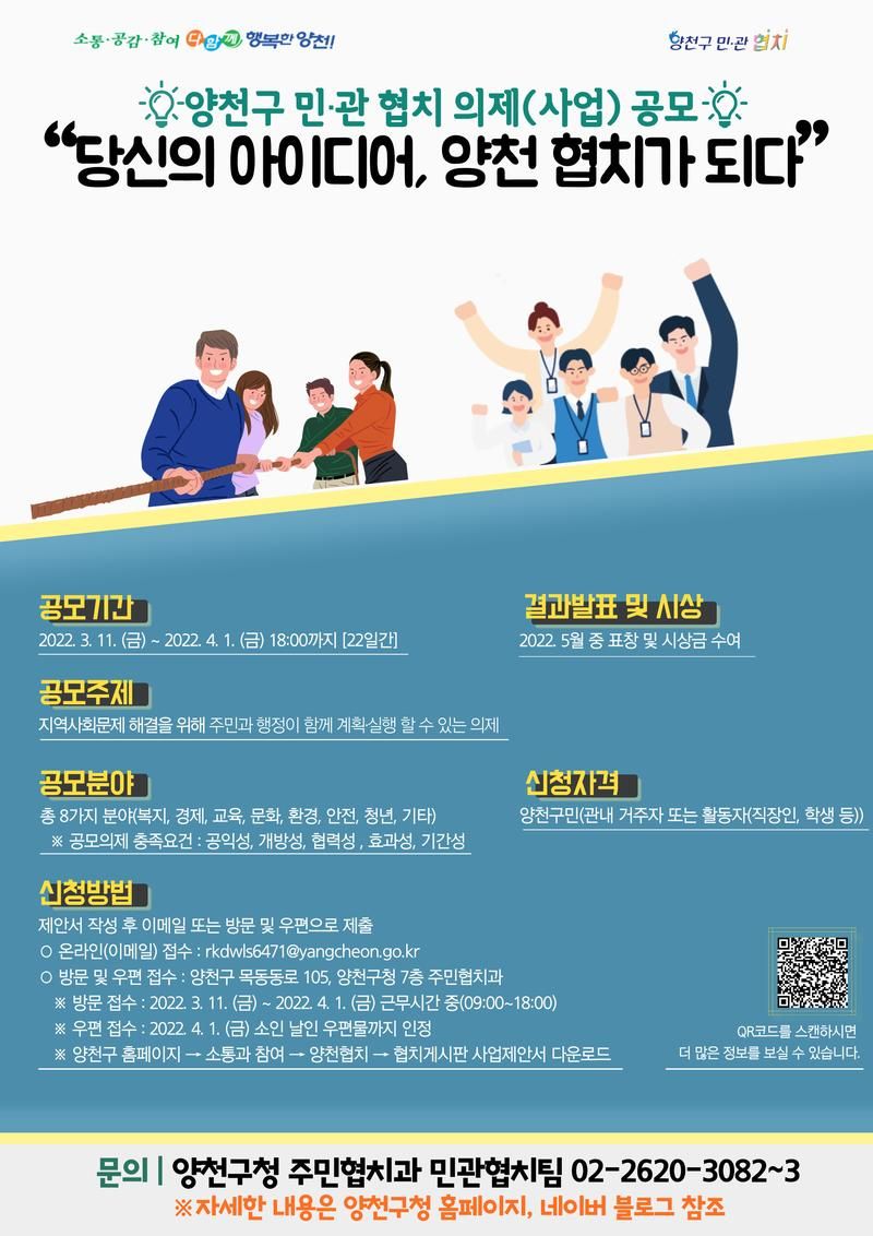 ○ 신청방법 : 제안서 작성하여 이메일(rkdwls6471@yangcheon.go.kr) 또는 방문·우편(주민협치과) 제출