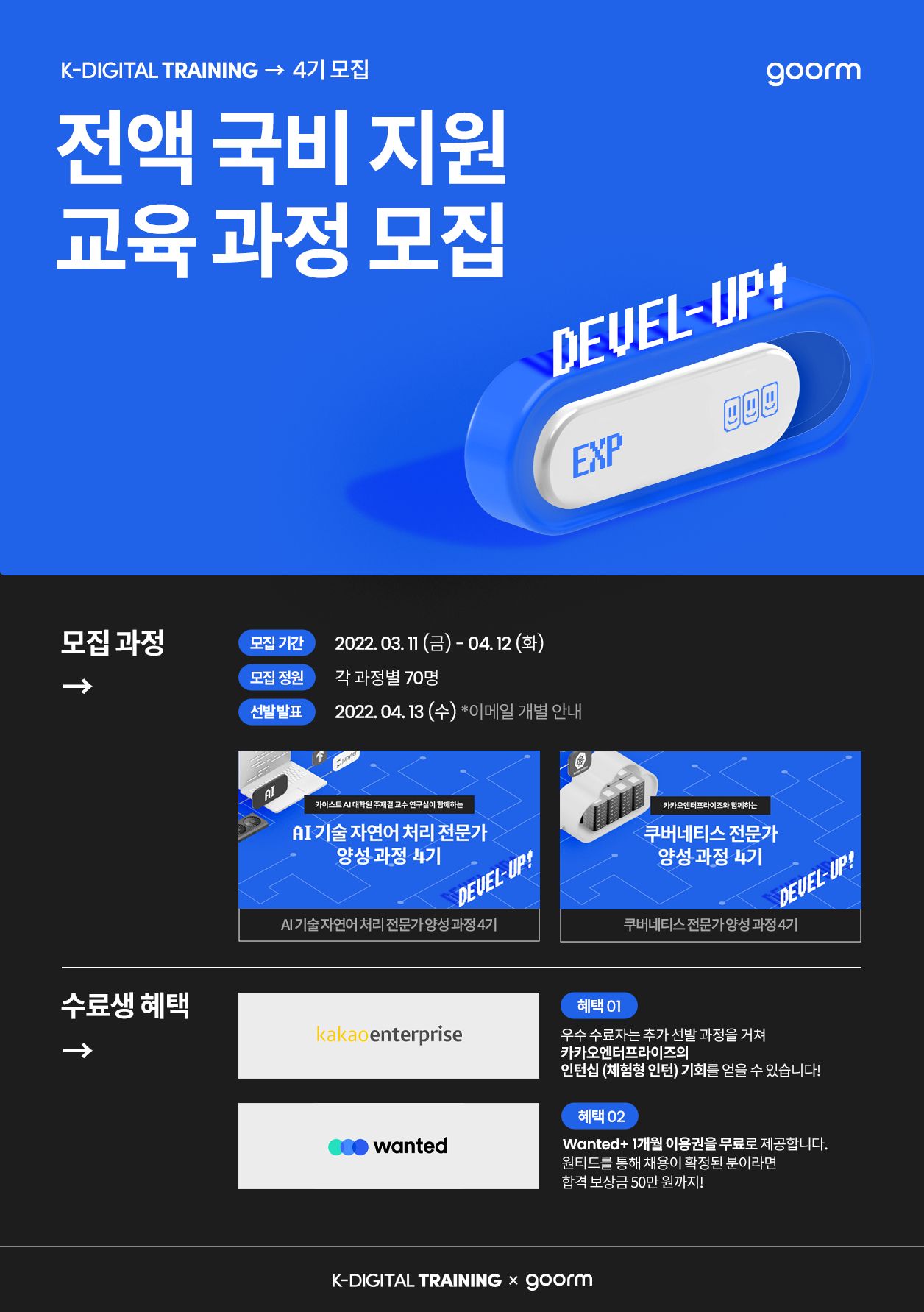 쿠버네티스 교육 과정에는 카카오엔터프라이즈, AI 자연어 처리 교육 과정에는 세계 최고 수준의 인공지능 연구를 진행하고 있는 카이스트 AI 대학원 주재걸 교수 연구실이 참여합니다. (쿠버네티스 과정의 경우 k-digital 교육기관 중 구름이 유일하게 제공합니다)