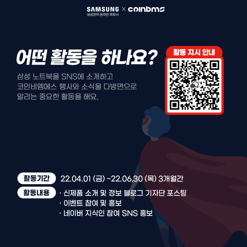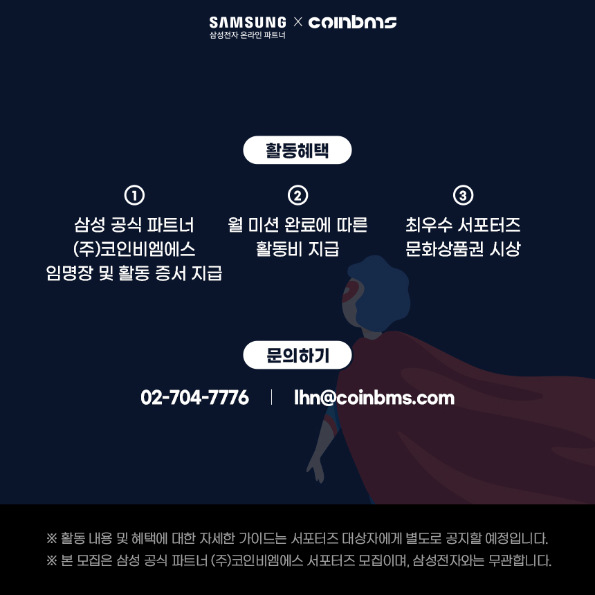 - 본 모집은 삼성 공식 파트너 (주)코인비엠에스 서포터즈 모집이며, 삼성전자와는 무관합니다.