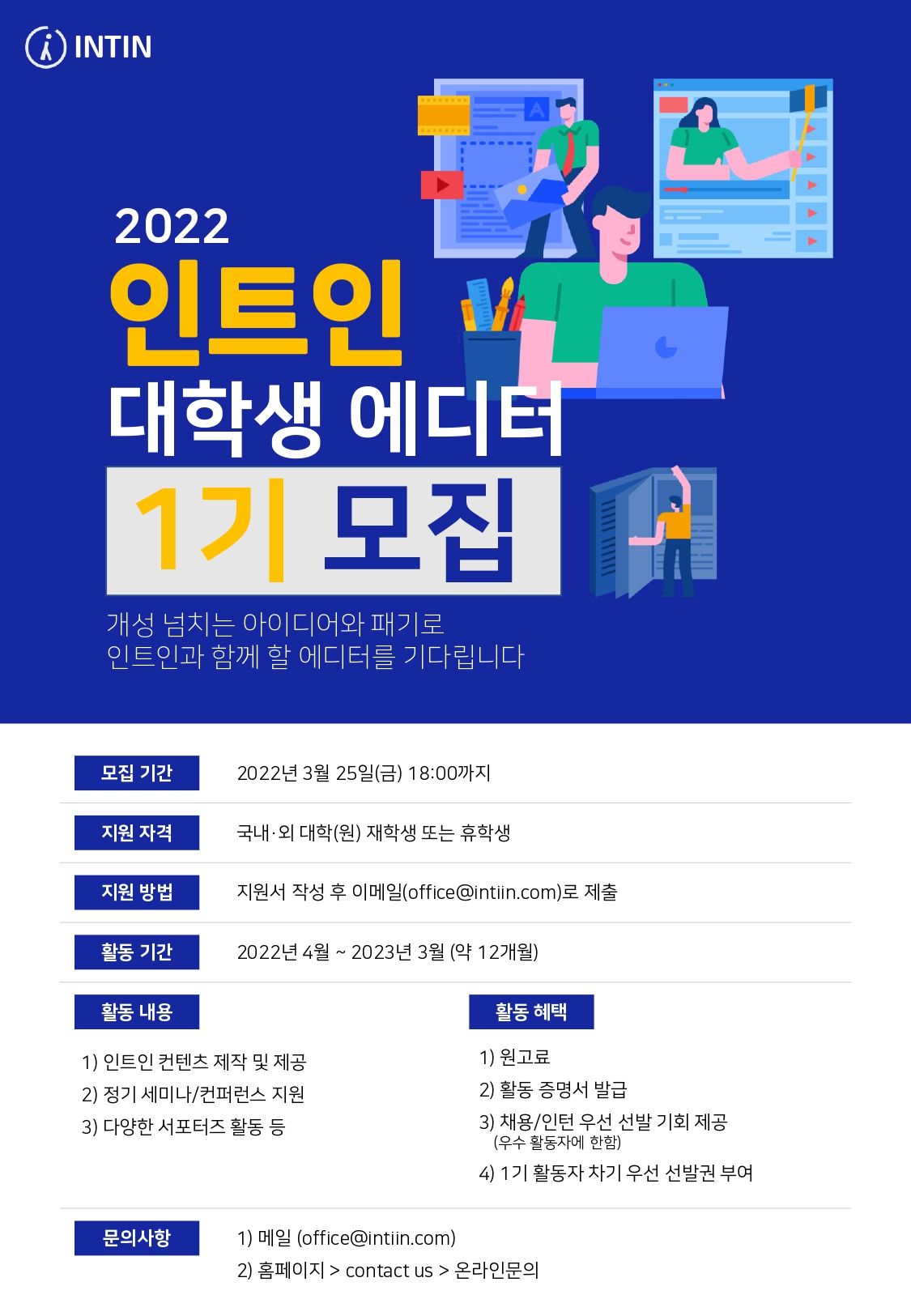전국 지역 대학생들과의 소통을 강화하기 위해 2022년도 인트인 ‘대학생 에디터’를 다음과 같이 모집합니다.