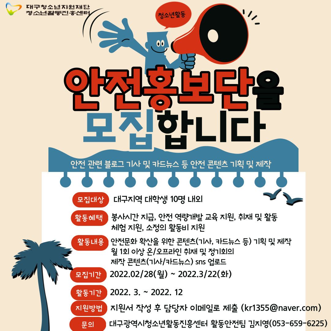 ■ 활동문의 : 대구광역시청소년활동진흥센터 활동안전팀 김지영 (053-659-6225)