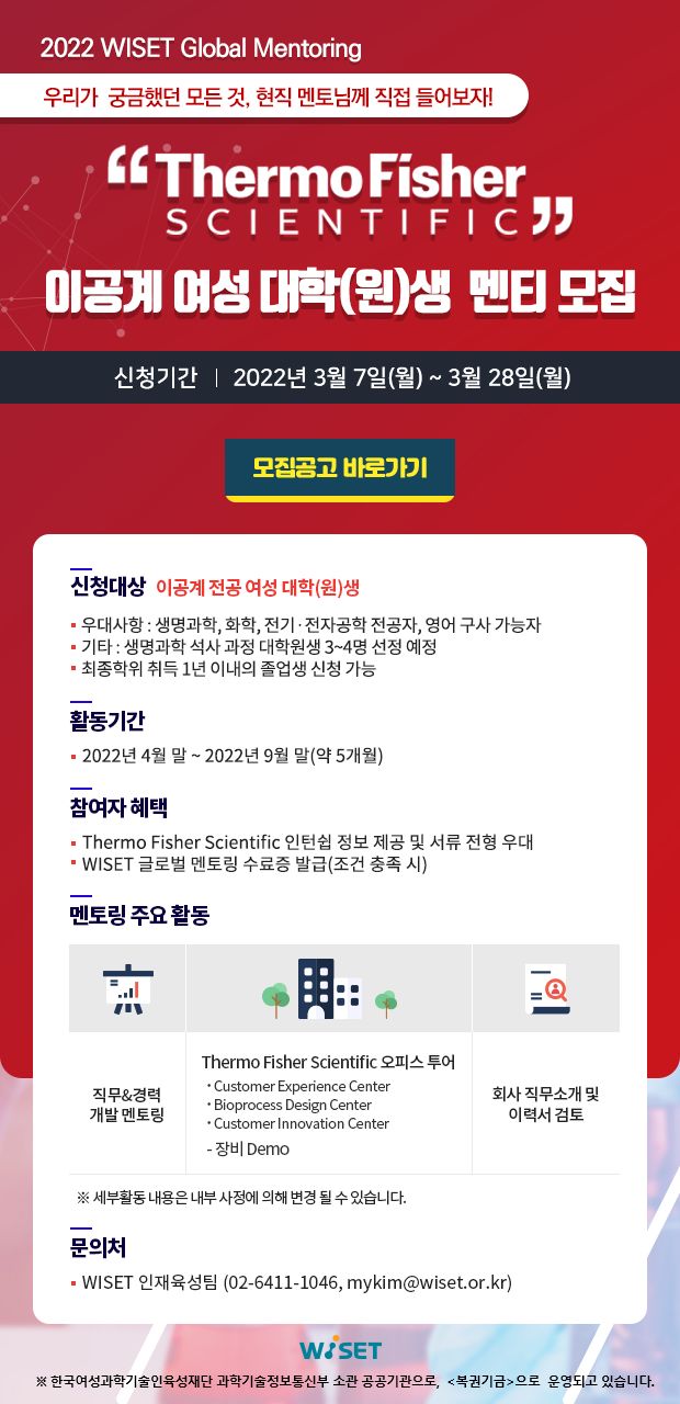 「WISET-Thermo Fisher Scientific 글로벌 멘토링」 멘티를 아래와 같이 모집 하오니