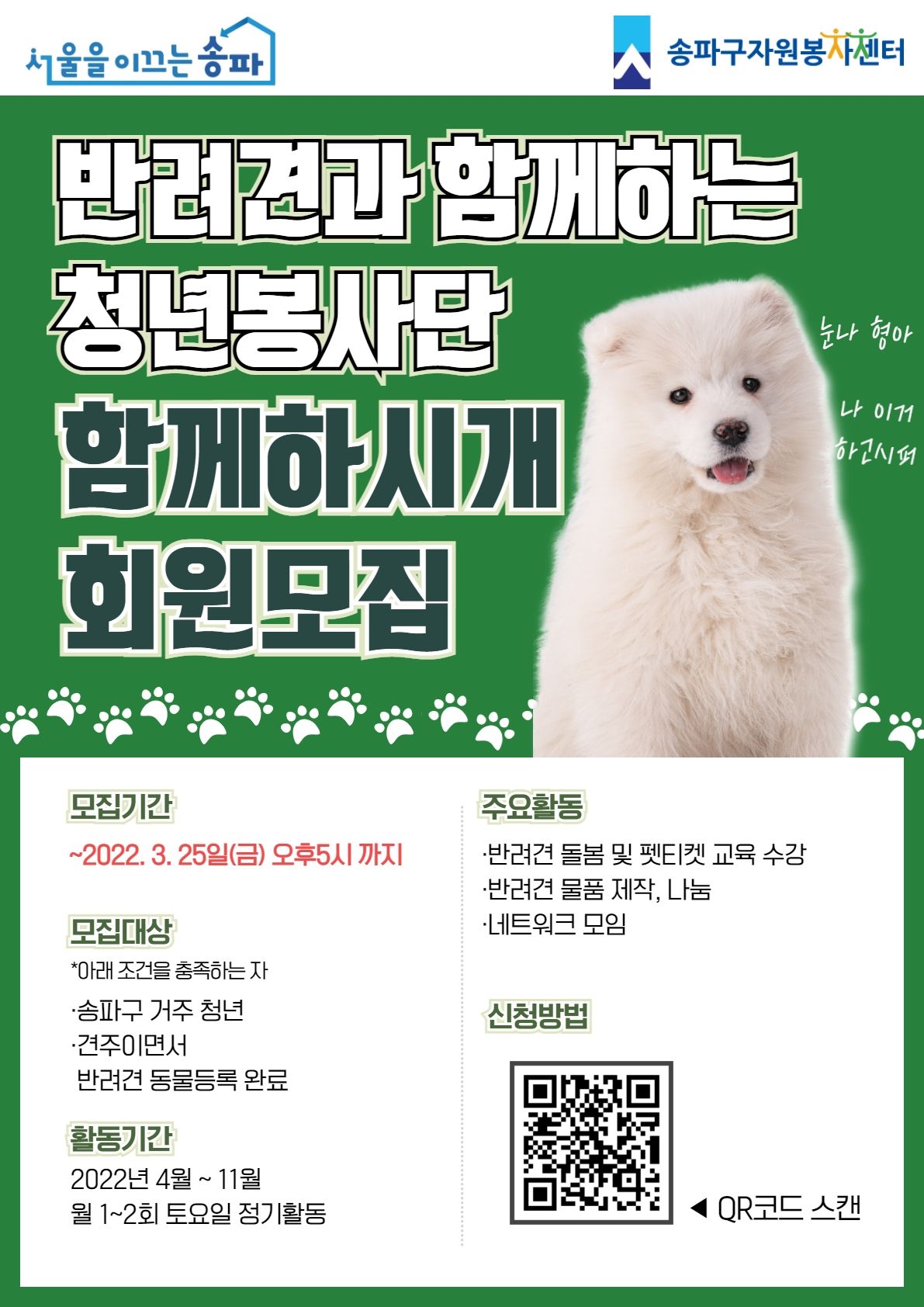 -지원자격 : ①송파구 거주 청년 ③견주이면서 반려견 동물등록 완료