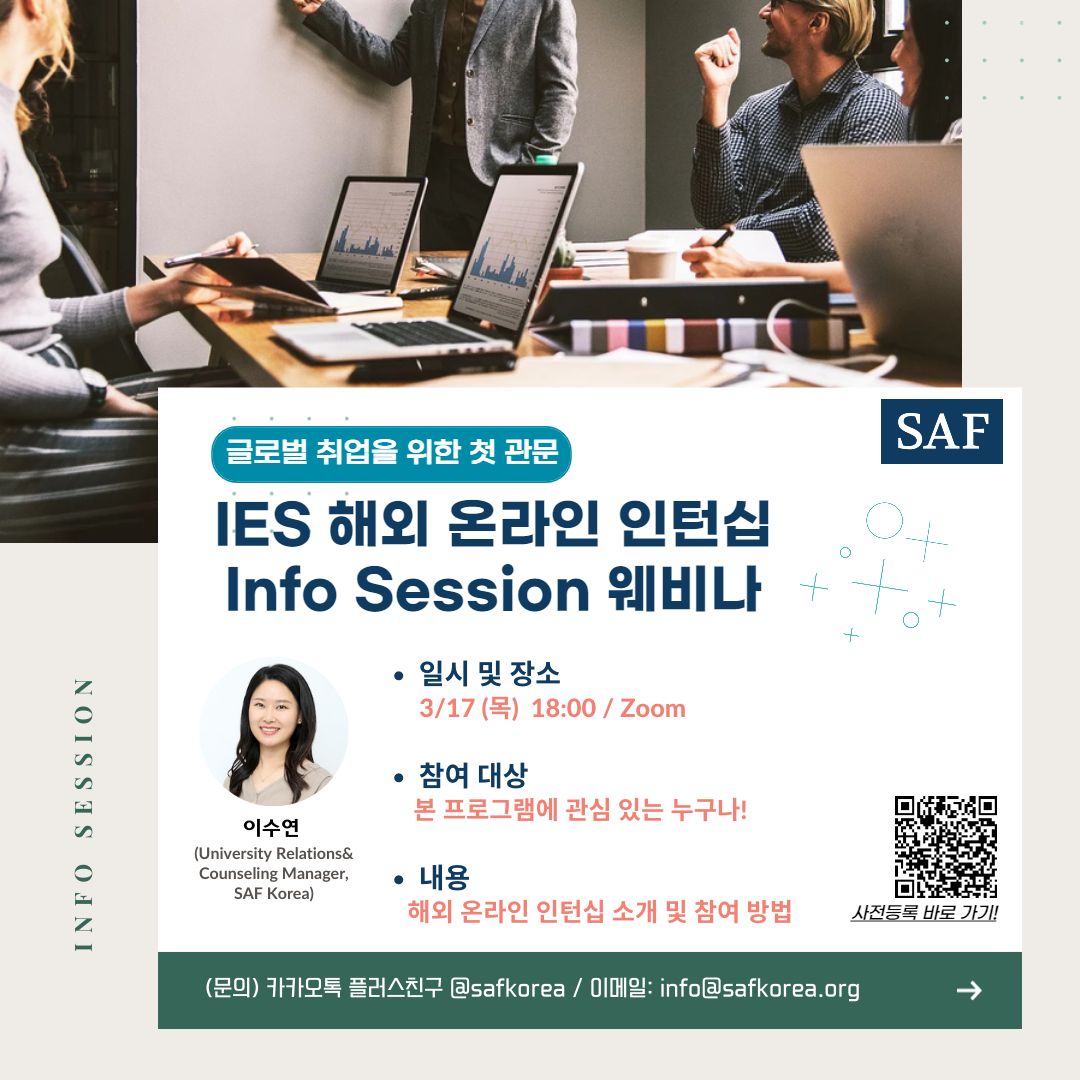 안녕하세요, SAF Korea는국내 SAF 회원교 재학생, 졸업생들의 방문학생, 교환학생, 유학 등 종합적인 프로그램 안내를 위해 정기적으로 웨비나를 진행하고 있습니다.