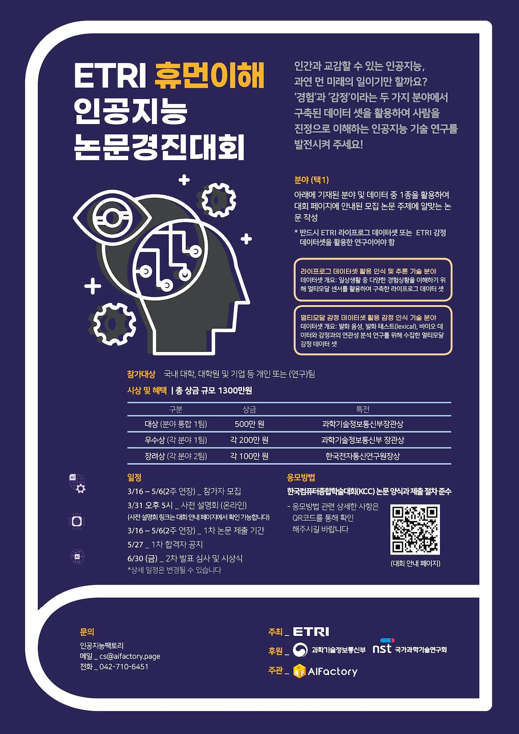 - ETRI 휴먼이해 인공지능 논문경진대회의 1차 논문제출 마감일이 기존 4/22(금)에서 --≫ 5/6(금)으로 약 2주 연장되었습니다!
