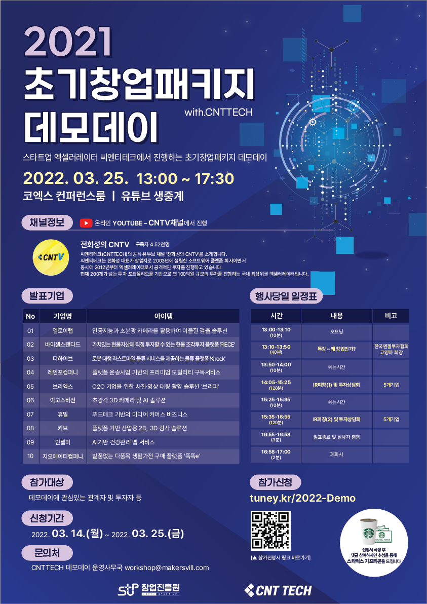 스타트업 액셀러레이터 씨엔티테크에서 진행하는 초기창업패키지 데모데이에 여러분을 초대합니다!