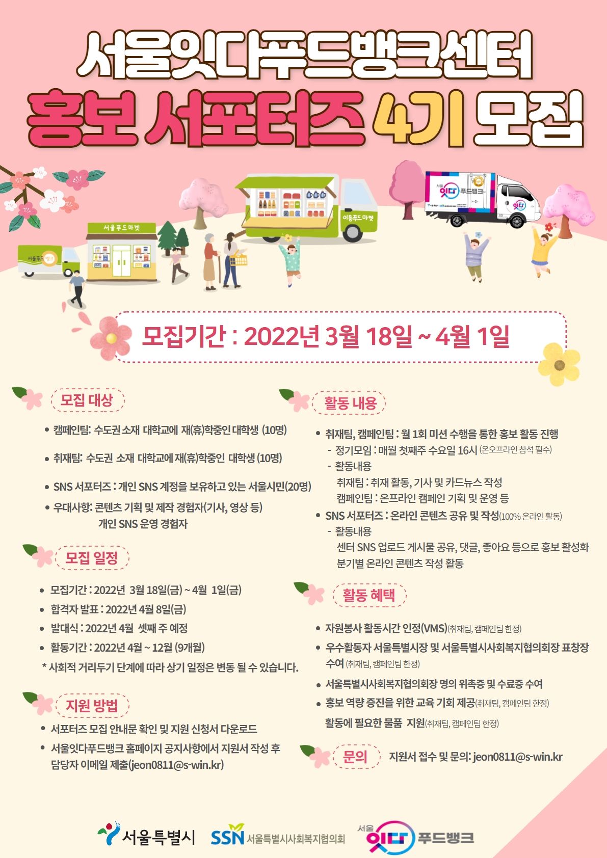 - 2022년 4월 1일(금) 18시 까지 서울잇다푸드뱅크 홈페이지 공지사항(http://www.s-foodbank.or.kr)에 게시된 지원서 양식 작성 후 제출