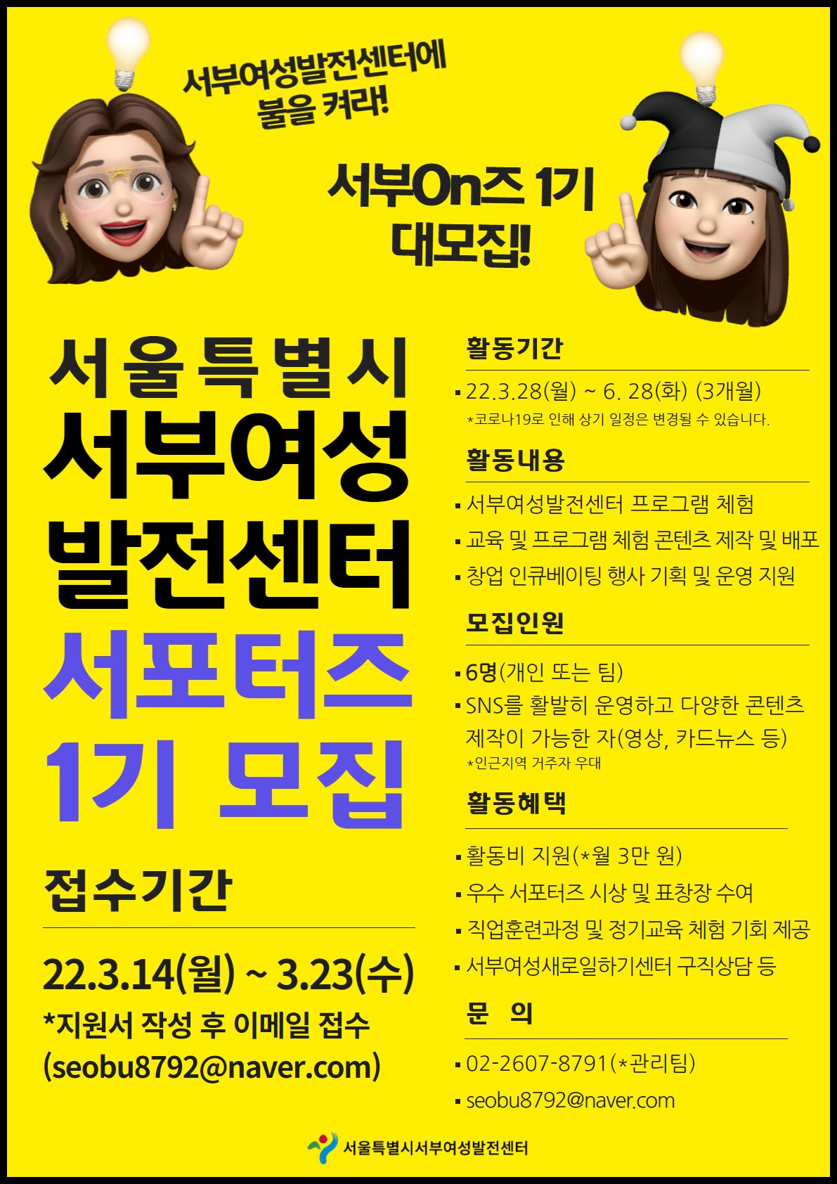 새 일에 도전하는 여성의 든든한 지원자, 서부여성발전센터에 불을 켜 줄 <서부On즈>를 모집합니다! 많은 관심과 지원 바랍니다.