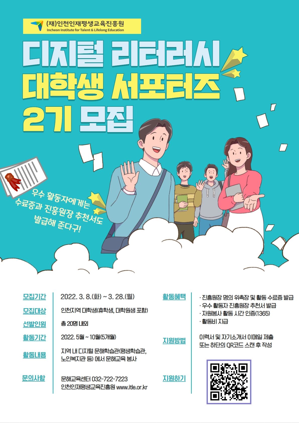 (재)인천인재평생교육진흥원에서는 지역 내 정보 문해 학습자 대상 맞춤형 문해교육 봉사활동에 참여할 ‘디지털 리터러시 대학생 서포터즈 2기(디지털 문해도우미)’를 아래와 같이 모집하오니, 활동에 관심 있는 분들의 많은 참여 바랍니다.